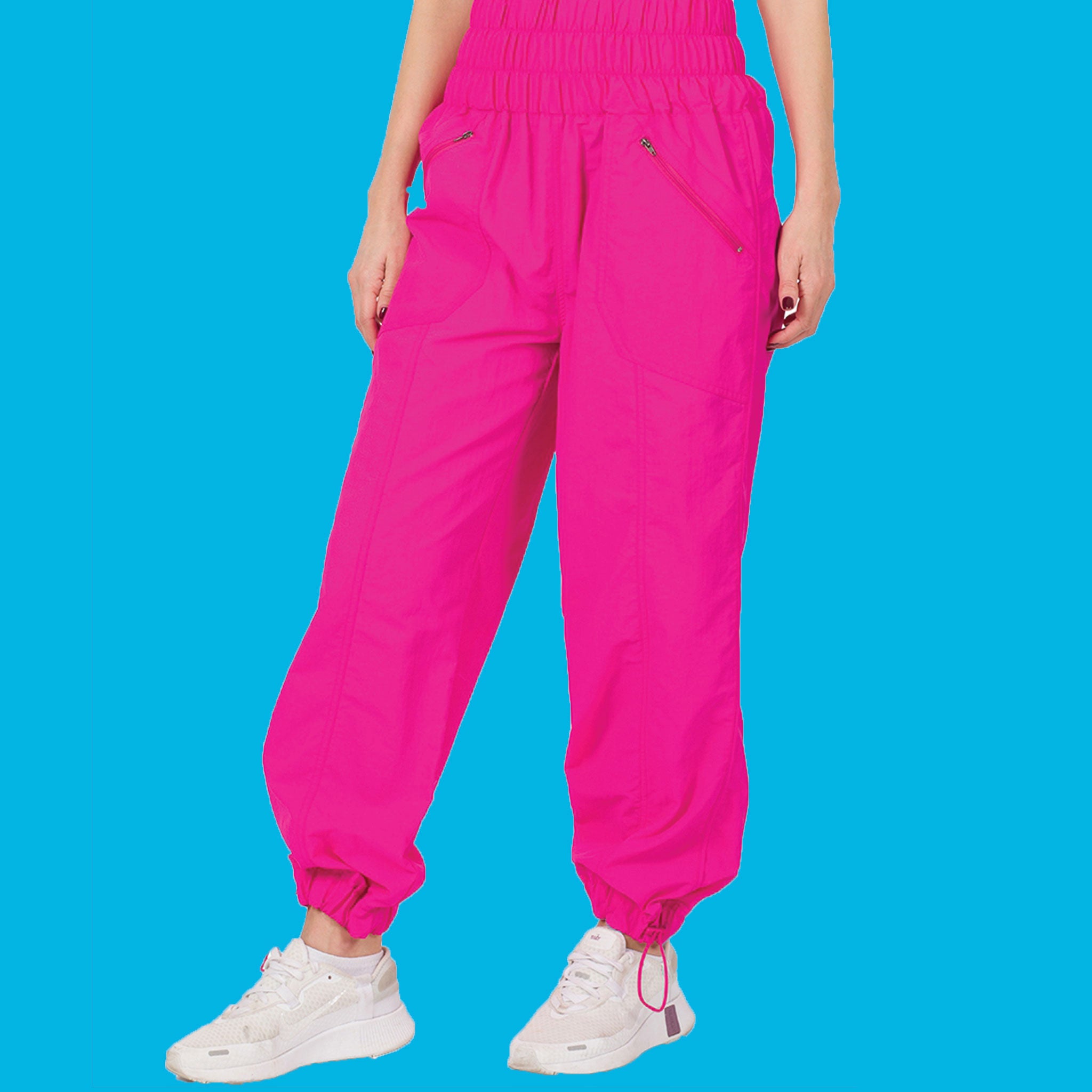 Spoil yourself with our jogger pants, crafted from a lightweight and breathable fabric, with a windbreaker smocked high waistband for added comfort. With its mesh pocket on the front and zip pocket on the side, wearing this jogger is as easy as it is stylish.